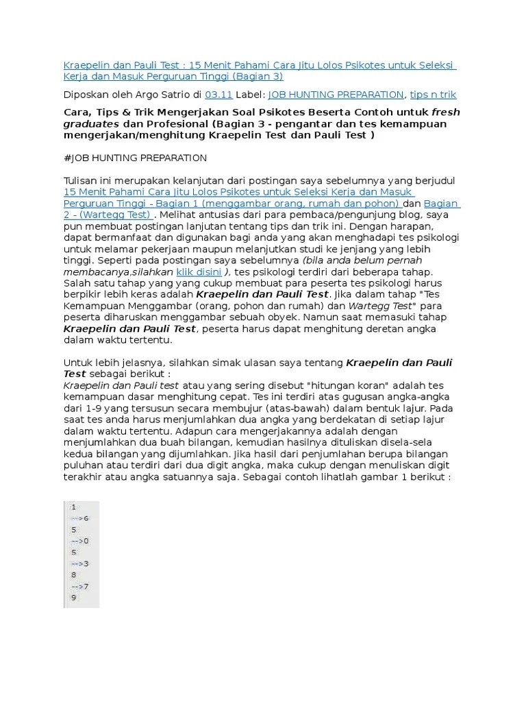 Download contoh soal tes kraepelin test kraepelin bisa juga disebut test pauli atau test koran adalah test yang mengambil kecepatan dalam . Soal psikotest | soalsoal tes psikotes panduan terlengkap sukses dalam menghadapi soal psikotes, soal psikotest, . Tes psikotes pauli dan kraepelin sering disebut sebagai tes koran. Download soal tes koran pauli 11 okt 2020 posting komentar soal psikotest koran pdf google drive test pauli kreaplin tes koran online guru ilmu . Berikut ini kami berikan link download dari tes koran yang sering keluar dalam psikotes .